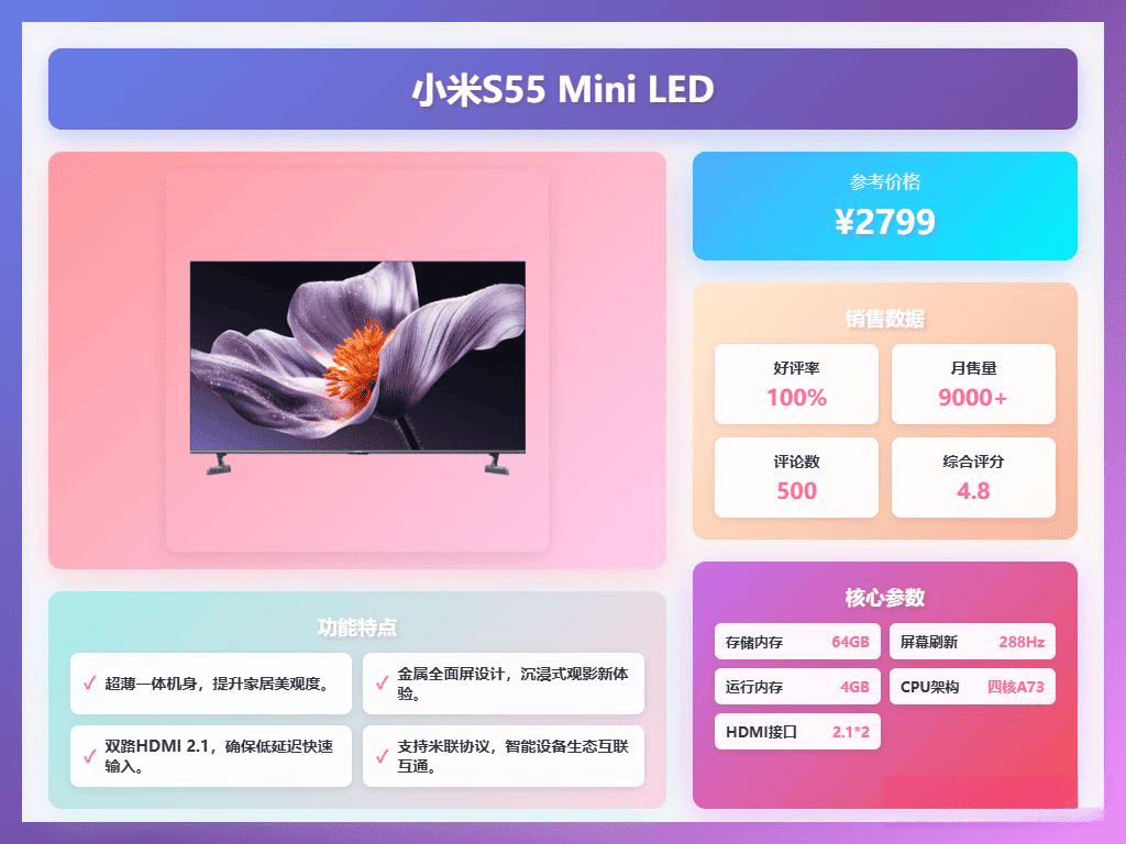 小米S55 Mini LED屏幕采用Mini LED背光技术,408个分区精控,画面对比度和细节提升明显。支持288Hz超高刷新率,玩游戏或看动作片时,画面流畅舒适。