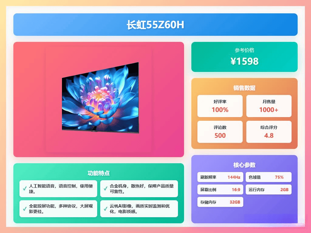 长虹55Z60H同样配备了144Hz高刷新率,结合云帆AI影像技术,画面细节调整得非常精细,能够自动响应环境亮度变化,保护眼睛。内置60W峰值功率的立体声音箱,音效震撼,适合家庭影院使用。