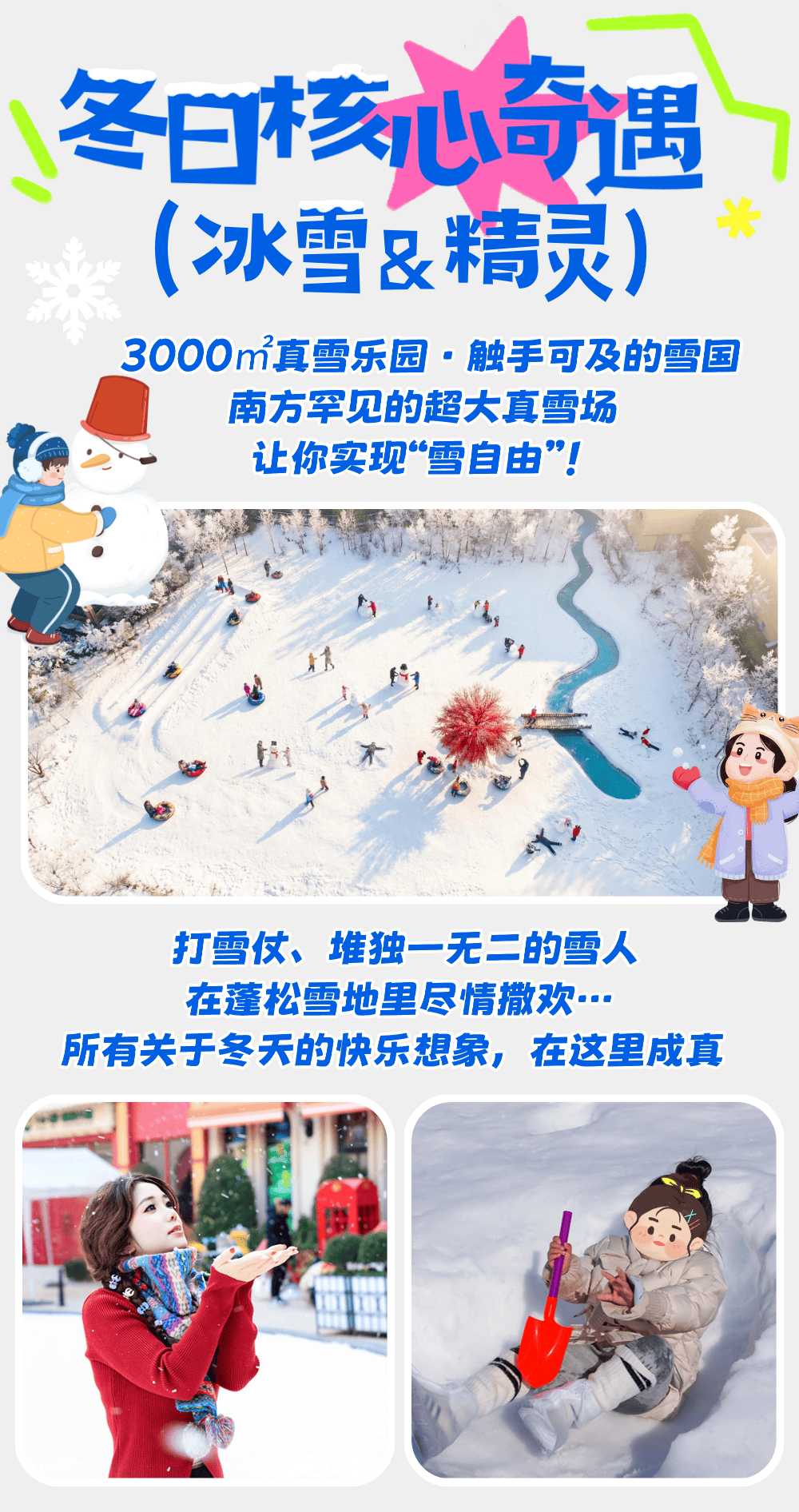 活动介绍:设有大型真雪场和飘雪街区,可尽情玩雪并与雪国精灵邂逅互动;每日有多场主题巡游及奇幻演出,夜晚更有浪漫烟花秀点亮夜空,并在跨年夜特别推出零点烟花与放飞祈福灯环节,共迎新年第一刻的浪漫;40余项乐园项目可畅玩,适合亲子互动与朋友结伴,共度冬日欢乐时光。