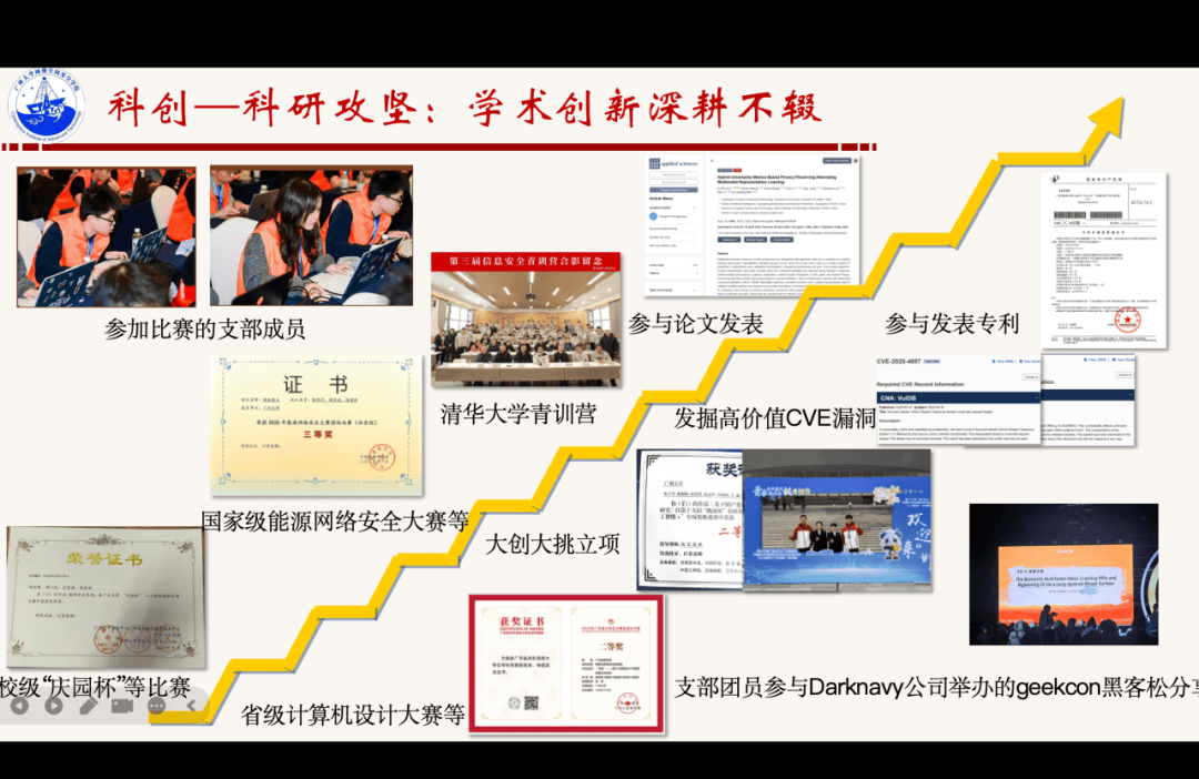 网安241班团支部以“科创为先,网安砺剑”为灵魂,支部参与前沿项目,在国家级信息安全赛事中斩获佳绩,实现科创实力与专业深度的双向突围。从驻守重大赛事的网络安全防线 小时的社会公益奉献,支部成员将算法与代码化为青春盾牌,在笃行中锻造出德才兼备、技艺精湛的网安新锐力量。