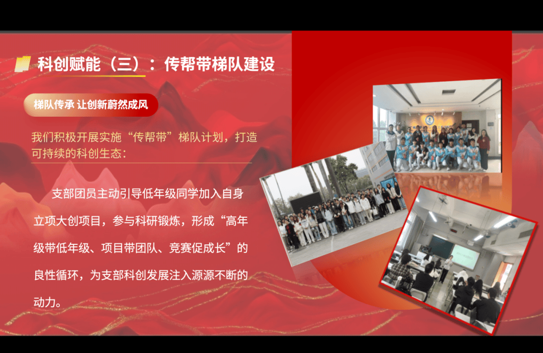 建环231班团支部搭建“思想—项目—梯队—学风”四位一体育人模式,理论学习全覆盖,在“青马工程”中坚定又红又专的成长方向;聚焦大创与高水平赛事,斩获佳绩并产出专利等多项成果,并通过“传帮带”梯队计划让科创精神蔚然成风;学风浓厚,奖学金与荣誉硕果累累。相信建环231班将继续让科创之路越走越宽,让青春之光更加闪亮。