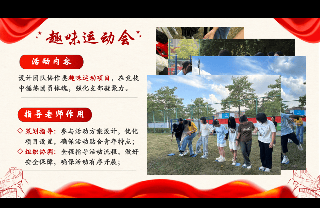 小教241班团支部深耕“红韵铸魂,艺体同行”特色,将红色文化传承融入趣味运动、经典诵读及手作创意。在党员导师全过程领航下,实现思政引领与师范生专业素养的深度结合。支部以扎实的组织根基为依托,在美育与体育的融合实践中引导团员成长,锻造出全面发展的先锋集体。