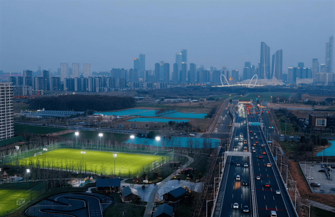 从江北驶上五桥,五桥之下,江心洲藏着一处宝藏打卡地——F₄PARK体育公园。