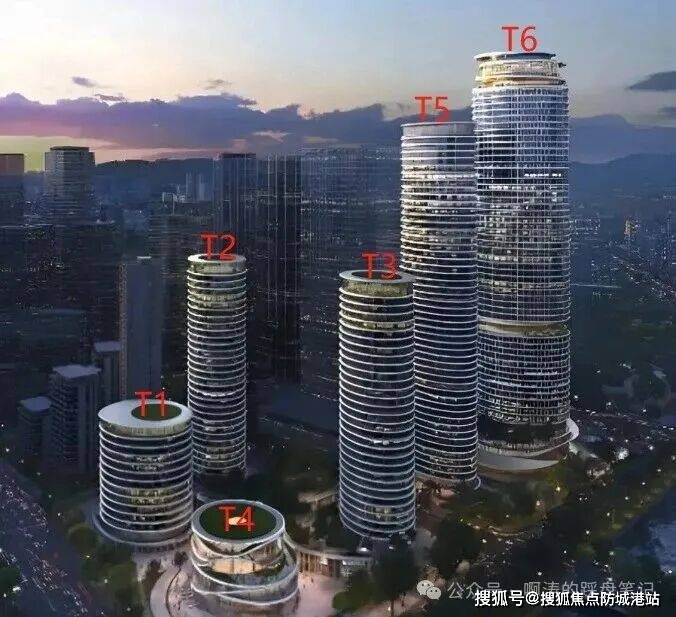 建筑规划:6栋高层建筑,分南北两区南区楼栋:T1-T4栋(T1-T3为顶级公寓,T4为湾颂艺术中心)
