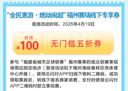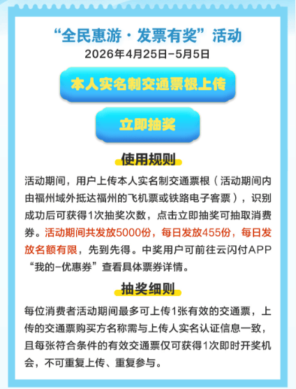 活动期间,凡乘坐飞机或火车从域外来榕的游客,只需登录云闪付APP活动专区,上传本人有效的抵榕交通票根(含电子客票),即可参与抽奖,赢取价值最高100元的“无门槛五折”文旅消费券。这张“见面礼”可在全市景区门票、老字号餐饮、文创伴手礼及小剧场演艺等报名商户通用。共计发放5000份,总额50万元。
