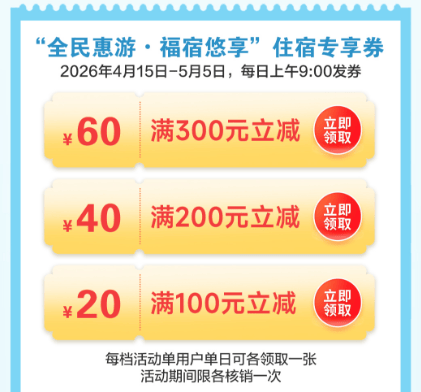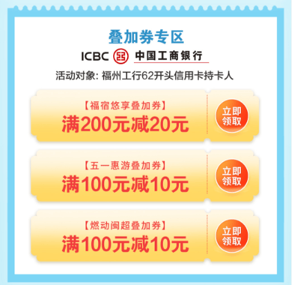 市民和游客可于每日上午9点,通过云闪付APP领取“满300减60”“满200减40”“满100减20”三档优惠券。该券适用于在飞猪等合作线上平台预订的福州星级饭店、备案民宿及景区内住宿。消费券领取后24小时内有效,未使用的名额将滚动释放,惠及更多用户。总计发放1.7万份,总额60万元。