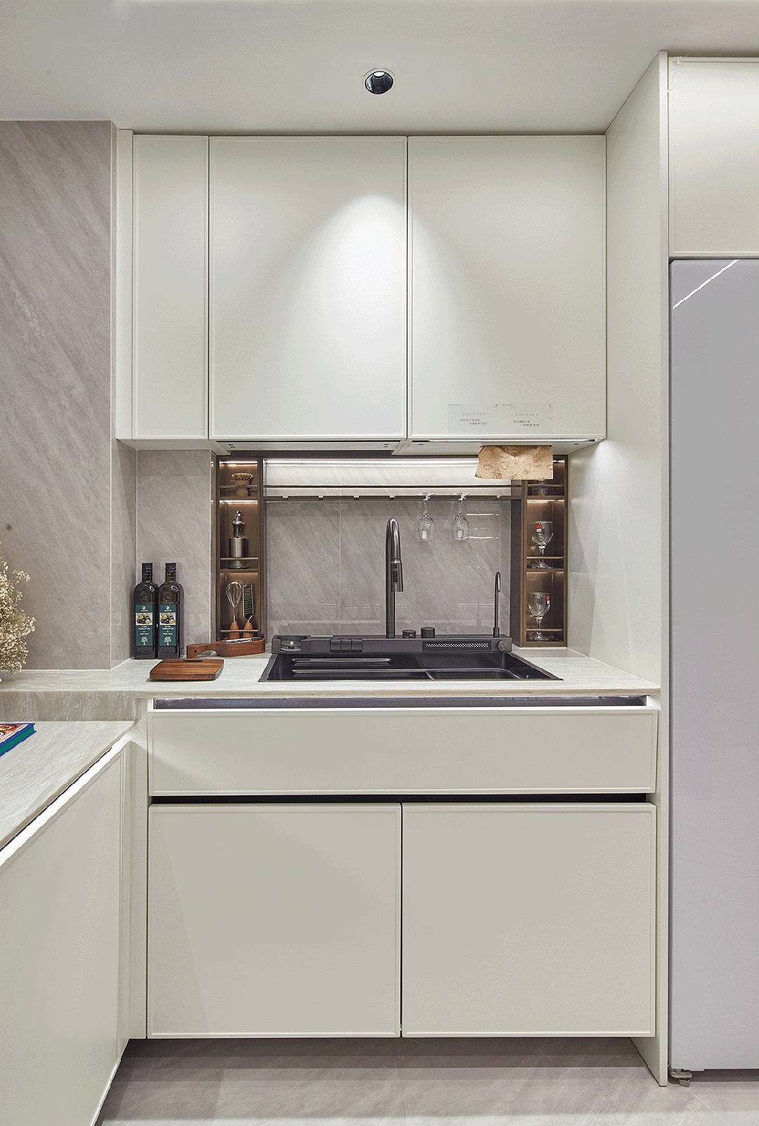 譬如说部分柜体更安全的圆角处理、高柜顶部一窥到底的镜面反光膜、大大提高空间利用的薄抽,不用弯腰一踢即开的踢脚抽设计,便利性大大增加;