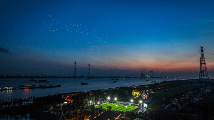 精彩比赛中,五彩斑斓的靖江本土品牌热气球带来浪漫氛围,展现出靖江低空经济活力;300架无人机组成的编队以浩瀚夜空为幕,光影流转间将村超赛事主题、靖江特色名片一一铺展,勾勒出靖江乡村振兴、城市欣欣向荣的壮美图景。