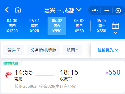 550元,长龙航空,14:55-18:15,直飞天府之国,看熊猫、吃火锅