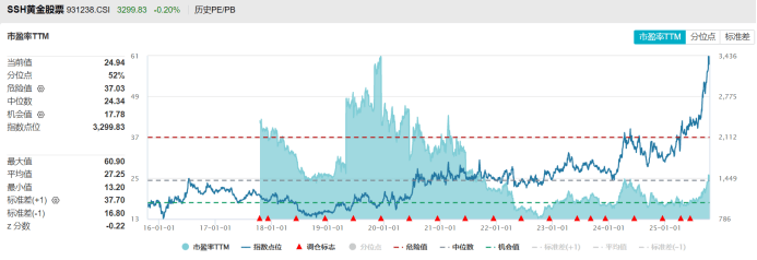 目前,黄金概念股、基持续活跃,从估值层面来看,以黄金股ETF跟踪的中证沪深港黄金产业股票指数(SSH黄金股票)统计,其目前市盈率24.94倍,处于近十年52%分位点;市净率3.8倍,处于近十年99.76%分位点。仅以年内行情计算,中证沪深港黄金产业股票指数在10月9日录得今年最高市盈率25.96倍,同日录得最高市净率3.96倍。