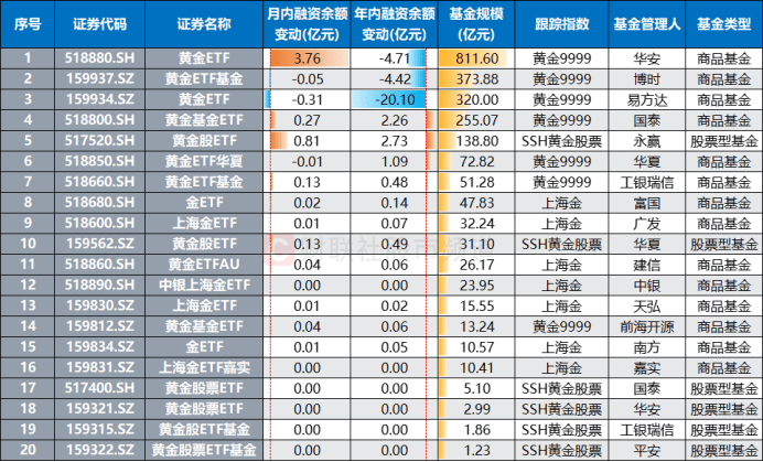注:目前20只黄金相关的股票型、商品型ETF月内/年内融资余额变动情况(截至10月16日数据)