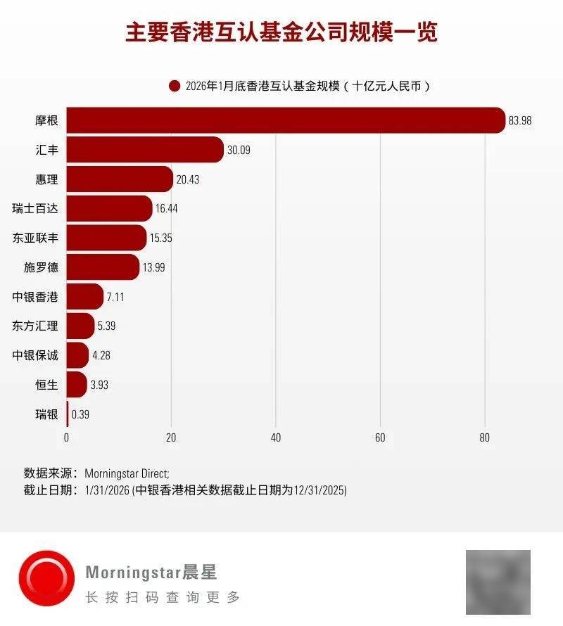 从香港互认基金市场份额来看,截至2026年1月,摩根旗下香港互认基金规模达840亿元,凭借超40%的市场份额,持续在市场中占据领先地位。汇丰和惠理分别以301亿元和204亿元的香港互认基金规模,位居第二、三位。紧随其后的惠理、瑞士百达、东亚联丰和施罗德,旗下香港互认基金规模均超10亿元,市场呈现出 “头部稳固、腰部竞争激烈” 的格局。
