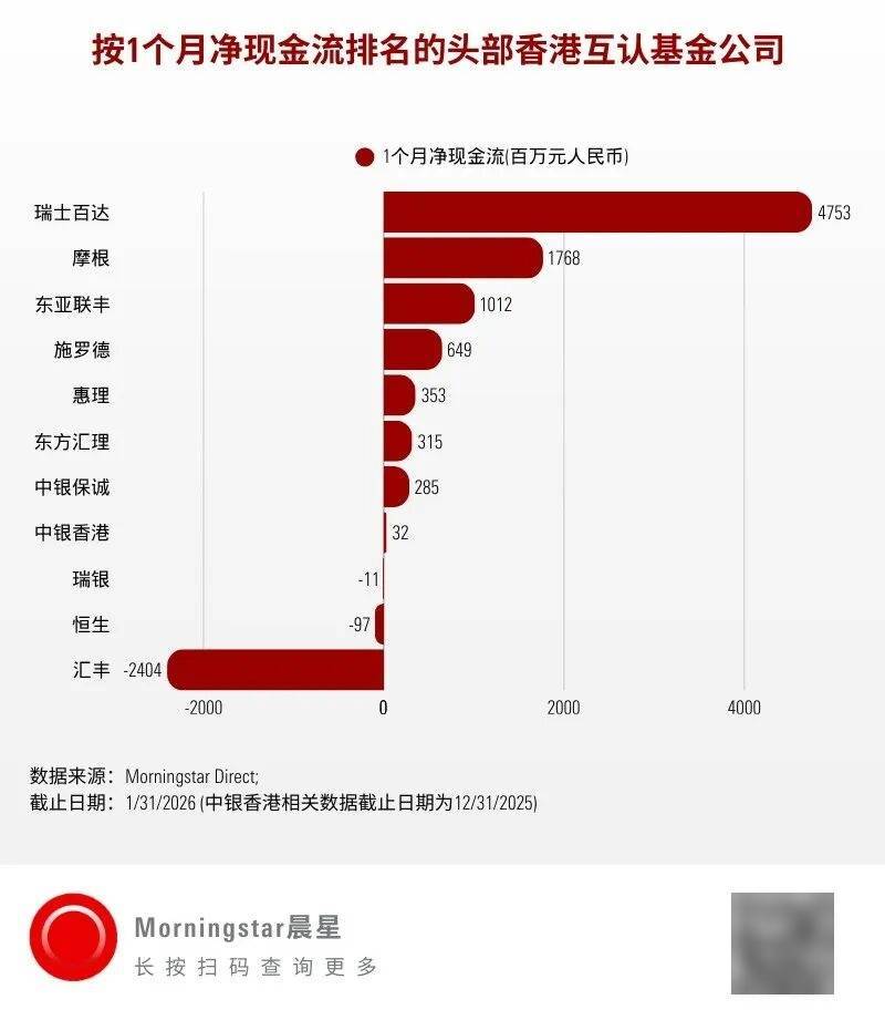 基金公司层面,瑞士百达凭借旗下唯一混合型互认基金的强劲吸金能力,荣登1月资金净流入榜首。摩根旗下多只股票型及债券型基金表现分化,但整体仍保持较强的资金吸引力;东亚联丰旗下股票型与债券型基金均有产品跻身净流入前十,月度净流入紧随瑞士百达和摩根之后。汇丰旗下多只债券型基金呈现净流出,致使其互认基金整体资金流表现欠佳。