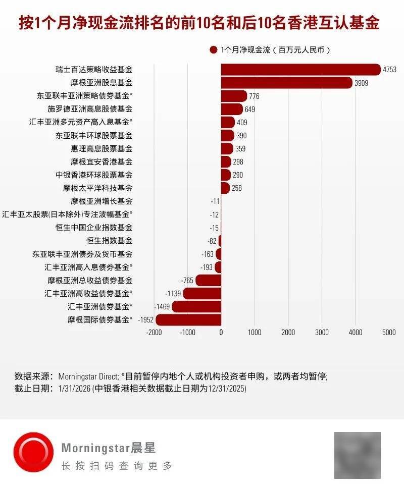 位居1月资金净流入榜首的是混合型基金——瑞士百达策略收益基金。该基金单月净流入资金达47.53亿元,大幅领先其他香港互认基金。其灵活配置于环球股票和固定收益证券,过去一年业绩表现远超同类(美元灵活配置型)基金,深受投资者青睐。此外,配置于亚洲股票和债券资产的施罗德亚洲高息股债和汇丰亚洲多元资产高入息两只混合型基金也分别实现6.49亿元、4.09亿元的月度净流入,成为当月香港互认基金的热门产品。