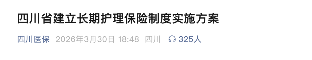 3月30日,四川医保局发文明确:2026年在有条件的统筹区启动实施长期护理保险制度,2027年全省全面实施长期护理保险制度。