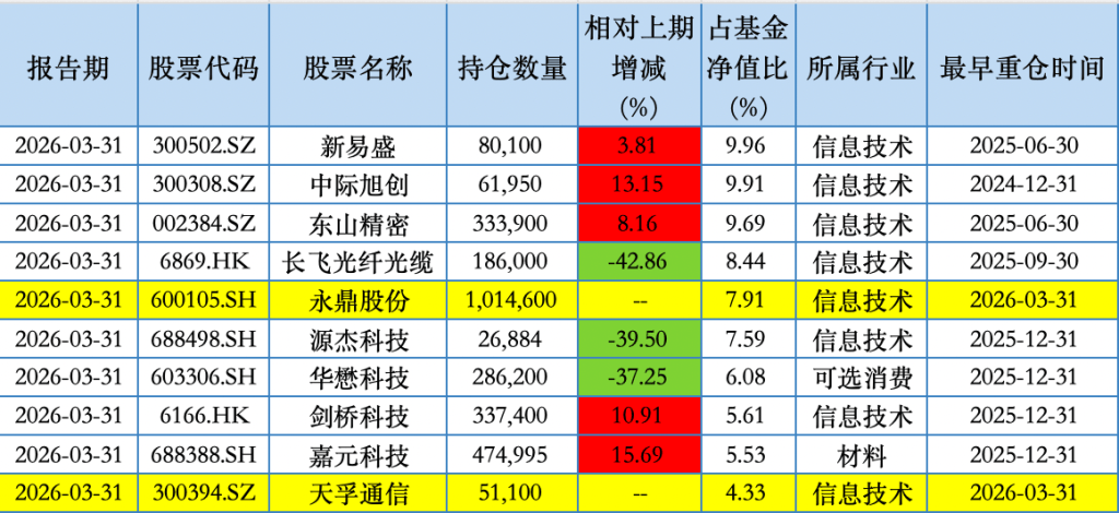 调仓方面,2026年一季度期间,融通产业趋势增持了新易盛、中际旭创、东山精密、剑桥科技以及嘉元科技;并减持了长飞光纤光缆、源杰科技与嘉元科技。值得注意的是,“易中天”中的天孚通信虽首次进入该基金持仓前十,但实际持股数量较2025年末减少了2.23万股,其“被动”上榜或源于一季度股价上涨。